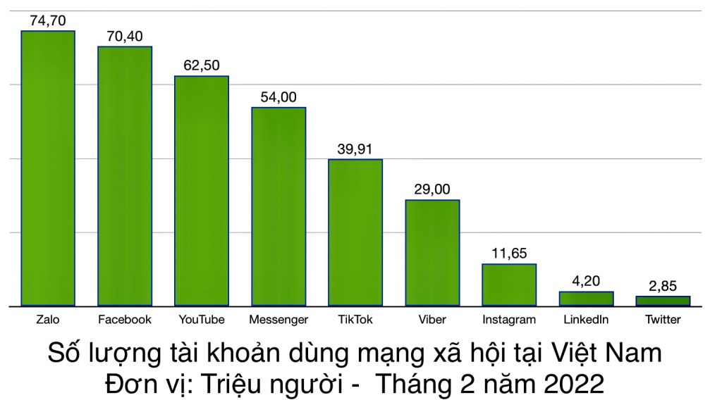 Bảng dữ liệu trên cho thấy, trong số 100 triệu người Việt, trừ đi khoảng 25 triệu là người dưới 12 tuổi và trên 80 tuổi, thì coi như mỗi người có một tài khoản Zalo, Facebook.