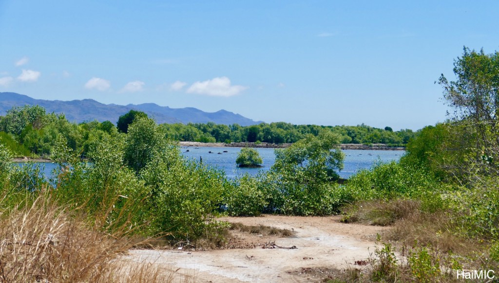 Bên kia đường bắt gặp những cánh đồng muối vẫn đang làm theo phương pháp cổ truyền: cho nước mặn vào, phơi nắng chờ muối kết tinh lại ở dưới.