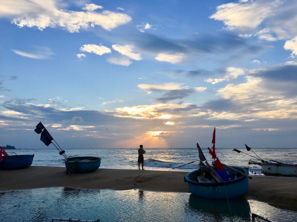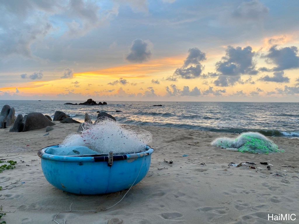 Khu nhà nghỉ ngay sát làng chài. Dù có dậy sớm đến đâu thì ra đến biển đều thấy bóng dáng con người đang làm việc.