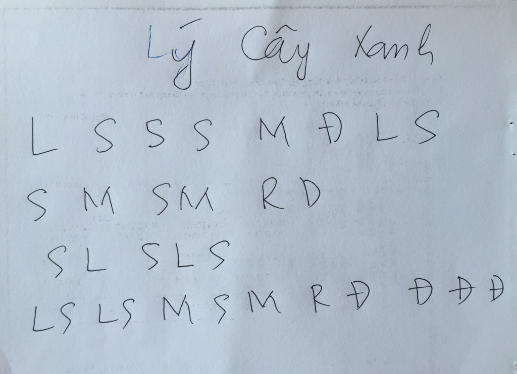 Không có chút kiến thức nào về nốt nhạc, việc học trở nên đơn giản. Giáo viên dán chữ S, Đ, L, R, M, F lên sát dây đàn tương ứng, kèm theo trang giấy ghi những chữ đó theo thứ tự của bài hát. Và tập gõ khi nào thuộc thì thôi.