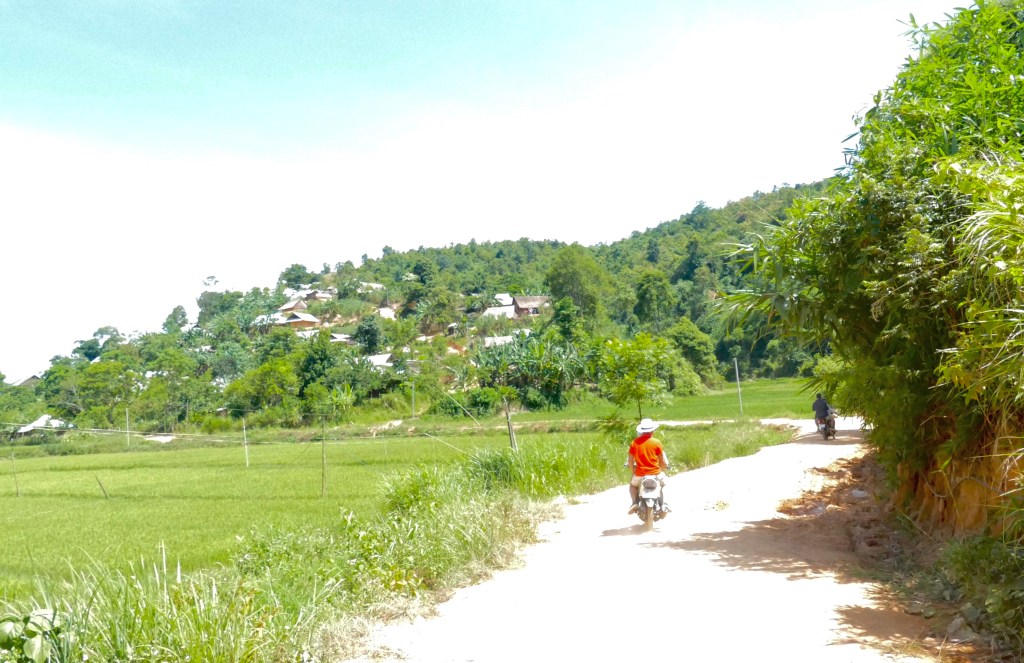 Quãng cuối 10 km chuyển sang đi xe máy. Ban Tổ Chức đã chu đáo chuẩn bị xe chờ sẵn. Thanh niên lái xe sống cách đây hơn 30 km, nói chưa từng đến vùng này bao giờ. Thú thực, cũng hơi run. Nhiều đường núi quanh co. Nhiều nơi dốc dựng đứng. Nhiều góc cua tay áo. Nhiều chỗ sát bờ vực. Bù lại, đi cả tiếng trên xe máy, tận mắt thấy được cảnh hùng vĩ của núi rừng miền biên giới xứ Nghệ.