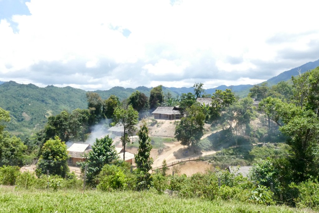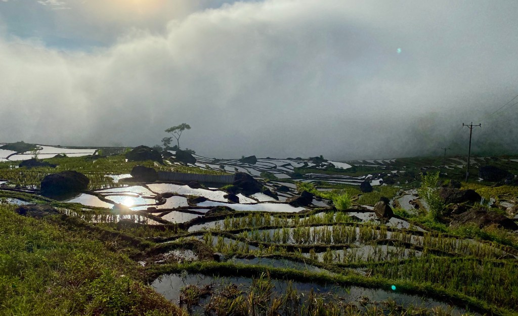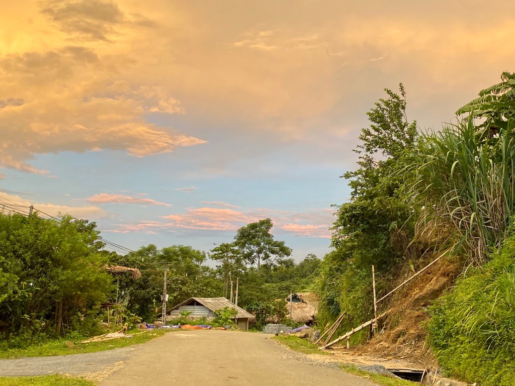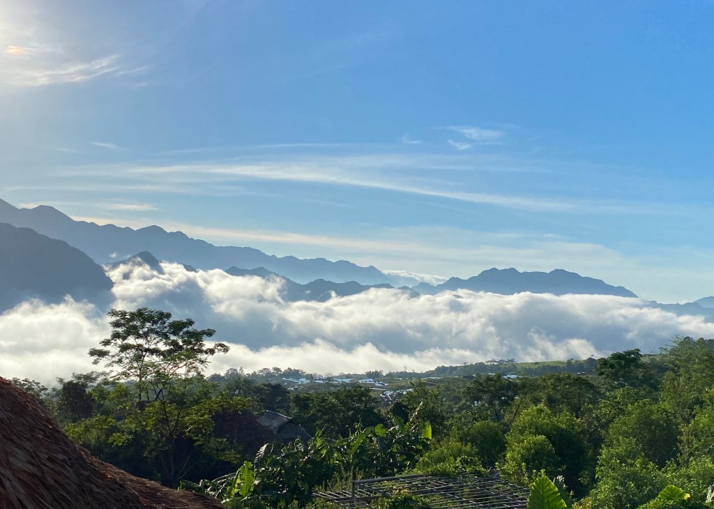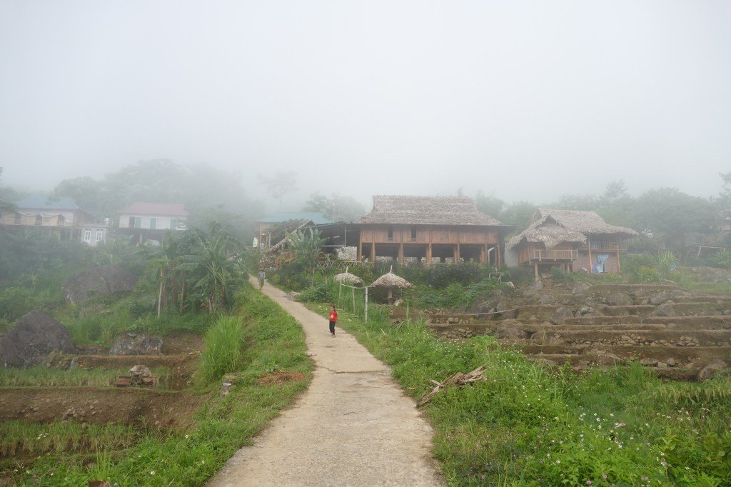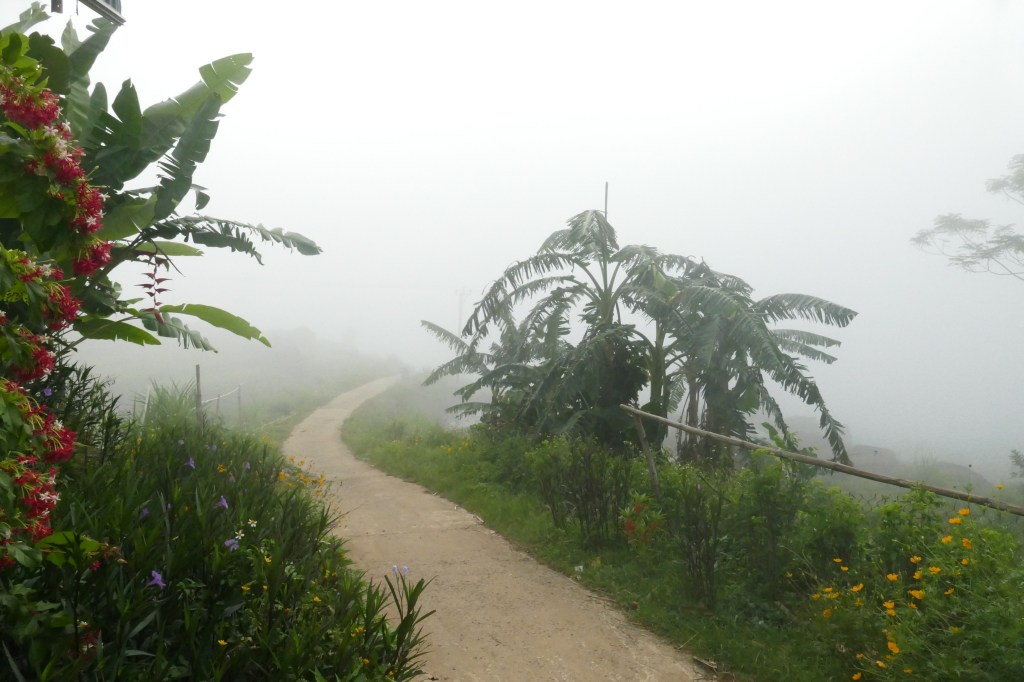 Sớm hôm sau, trời còn đang hửng nắng sáng. Chỉ vài phút trôi qua, mây mù bất ngờ sà xuống, che hết mấy đỉnh núi phía xa. Đi bộ vào bản làng, đường xá, nhà cửa chỉ còn lại những hình hài lờ mờ trong làn sương mù mịt…
