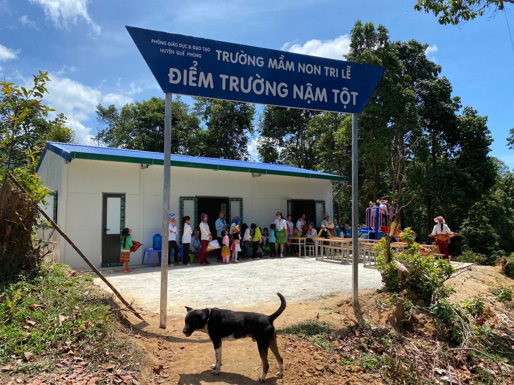 Đi từ 6h sáng, đến Nậm Tột là gần 11h trưa. Lớp học xây trên nền đất mới, thoáng đãng, rộng rãi đủ cho trẻ mầm non trong bản. Dân làng đã náo nức tập trung từ sáng sớm.