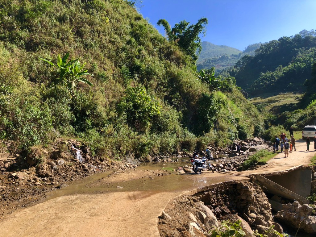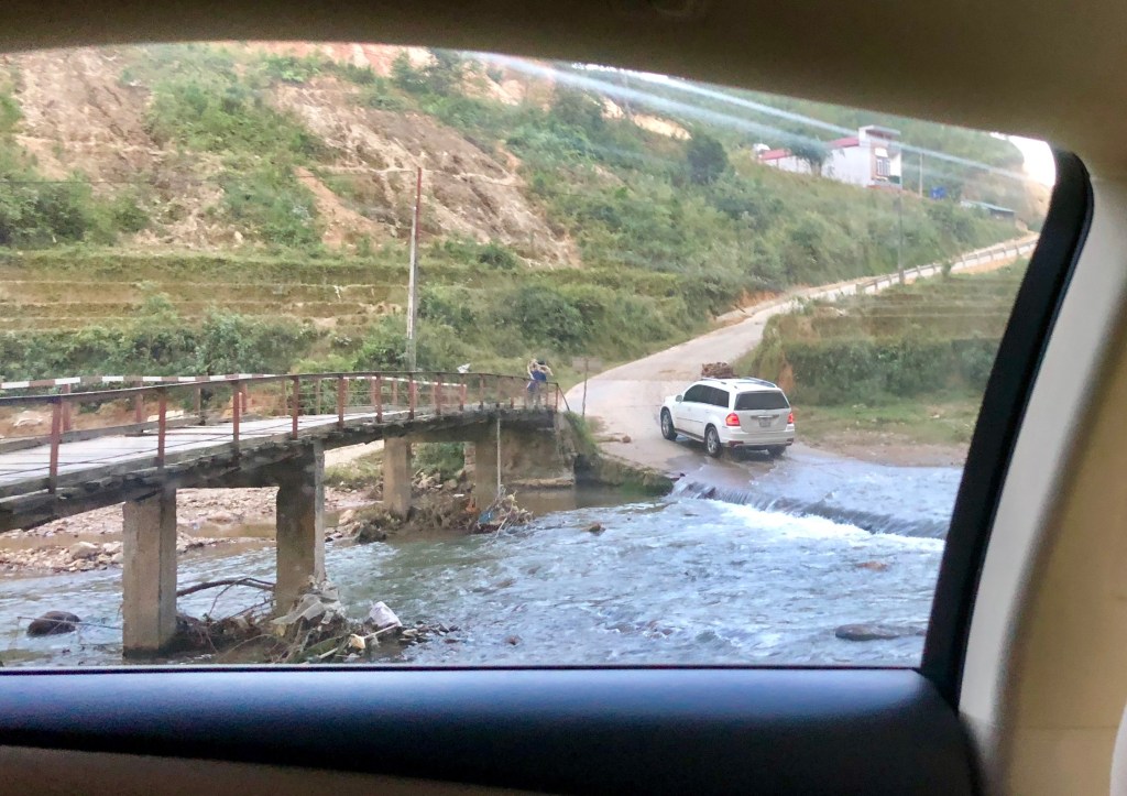 Bản cách đây 5km. Đi bộ chắc mất vài tiếng. Đi ô tô, phải dùng xe gầm cao, mặc dù cũng khá vất vả khi qua vài cây cầu đã bị tràn bờ do vụ lũ trước đó.