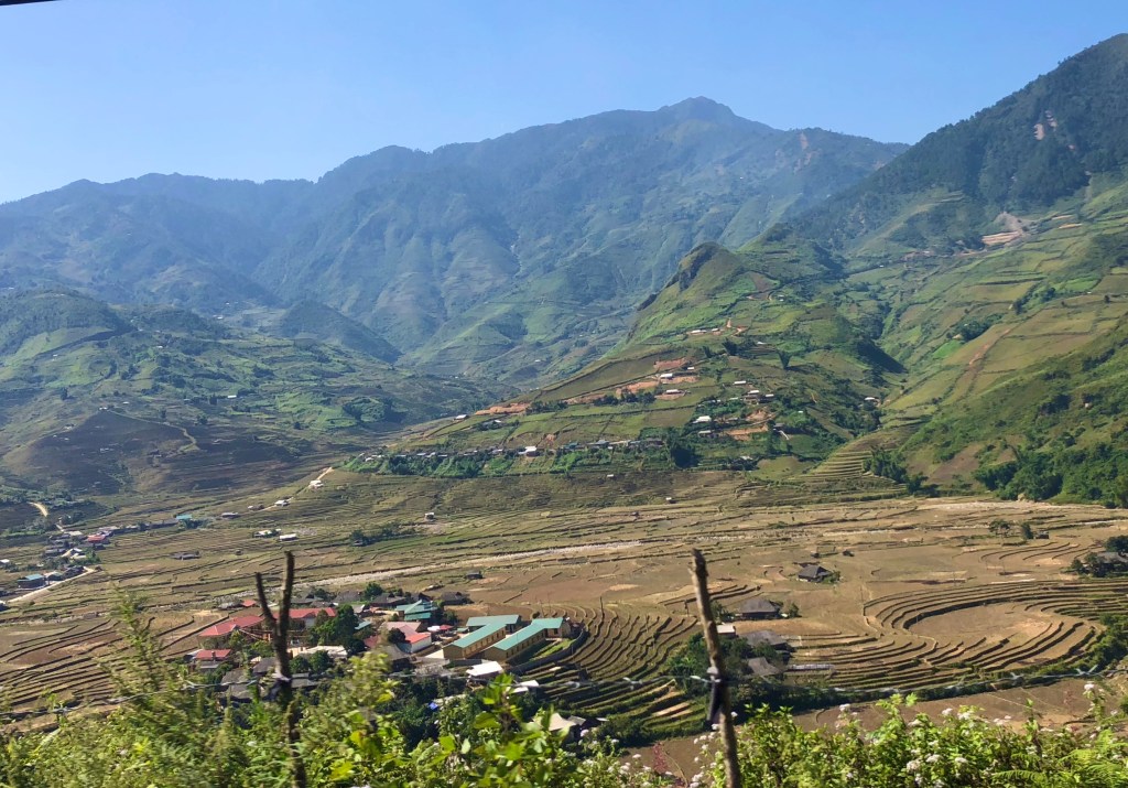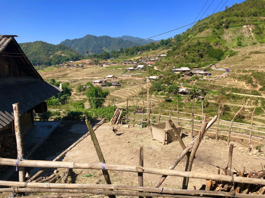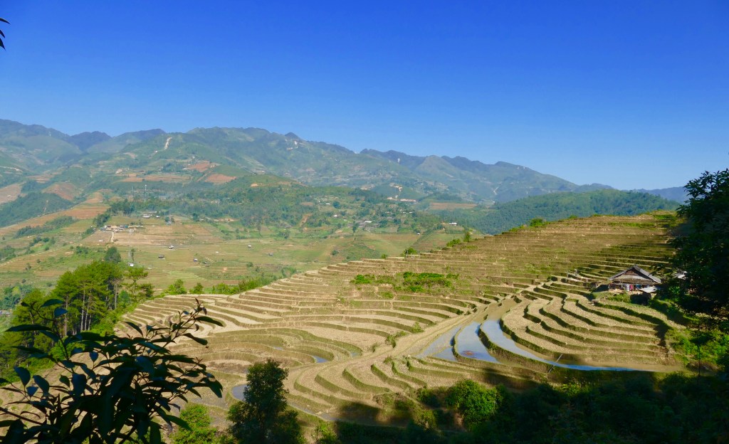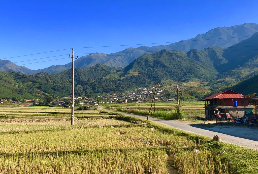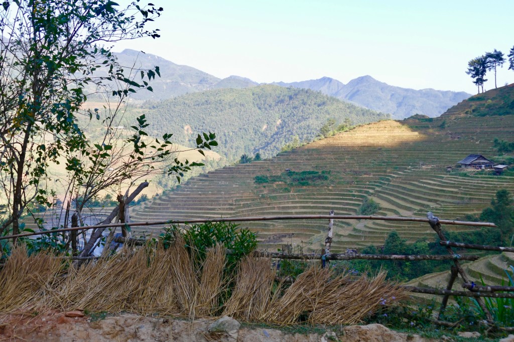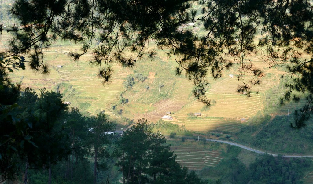 Thấp hơn là ruộng và mấy mái nhà tranh. Dân bản ở đây trồng 2 vụ. Chỉ thắng vụ hè-thu, còn vụ đông-xuân, lúa không năng suất lắm vì trời rét (lạnh). Trước khi gieo hạt họ phải cho nước xuống để ngâm cho đất kịp ngấu. Khi đó, những cánh ruộng bậc thang bao la sẽ lóng lánh nước dưới ánh nắng mặt trời. Đây cũng là mùa săn ảnh của những tay thợ chuyên nghiệp.