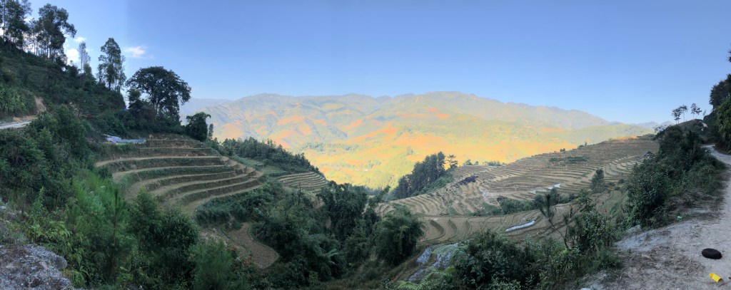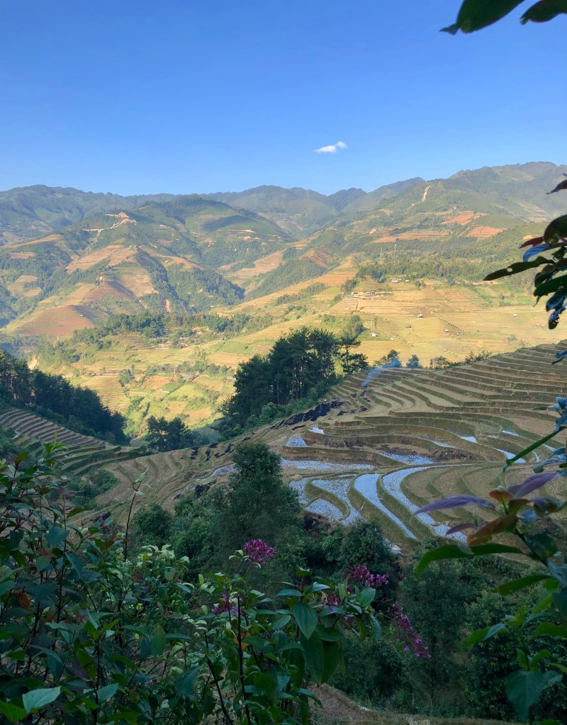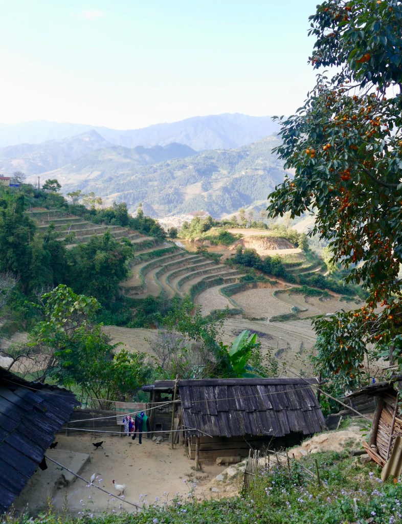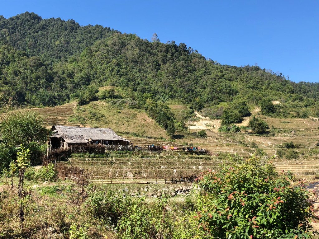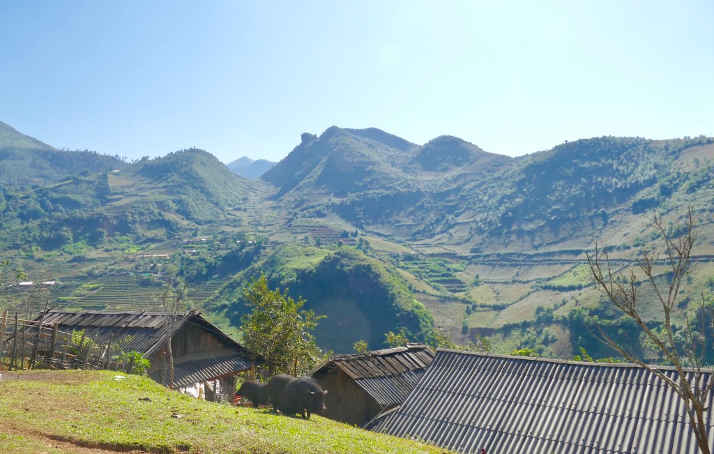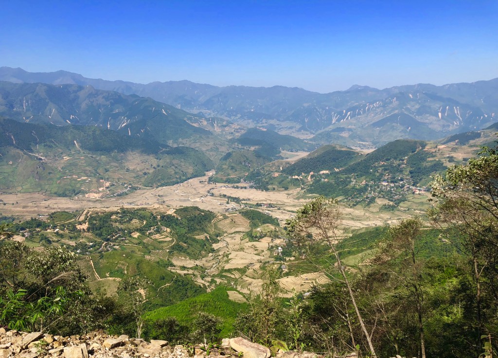 Thấp hơn là ruộng và mấy mái nhà tranh. Dân bản ở đây trồng 2 vụ. Chỉ thắng vụ hè-thu, còn vụ đông-xuân, lúa không năng suất lắm vì trời rét (lạnh). Trước khi gieo hạt họ phải cho nước xuống để ngâm cho đất kịp ngấu. Khi đó, những cánh ruộng bậc thang bao la sẽ lóng lánh nước dưới ánh nắng mặt trời. Đây cũng là mùa săn ảnh của những tay thợ chuyên nghiệp.
