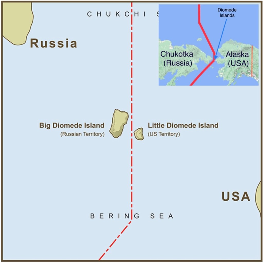 Big Diomede nằm ở phía Nga trong khi Little Diomede nằm ở phía Hoa Kỳ. Vào mùa đông, cây cầu băng tự nhiên hình thành giữa hai hòn đảo, có thể đi bộ một quãng ngắn giữa chúng và được “du hành xuyên thời gian”. Để xem chiếc đồng hồ cơ học có nhảy số được không.