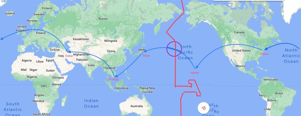 Trong chuyến du lịch vừa qua, phải bay một vòng trái đất theo tuyến: TP HCM – Dubai – Boston – Hawaii – Tokyo – TP HCM.