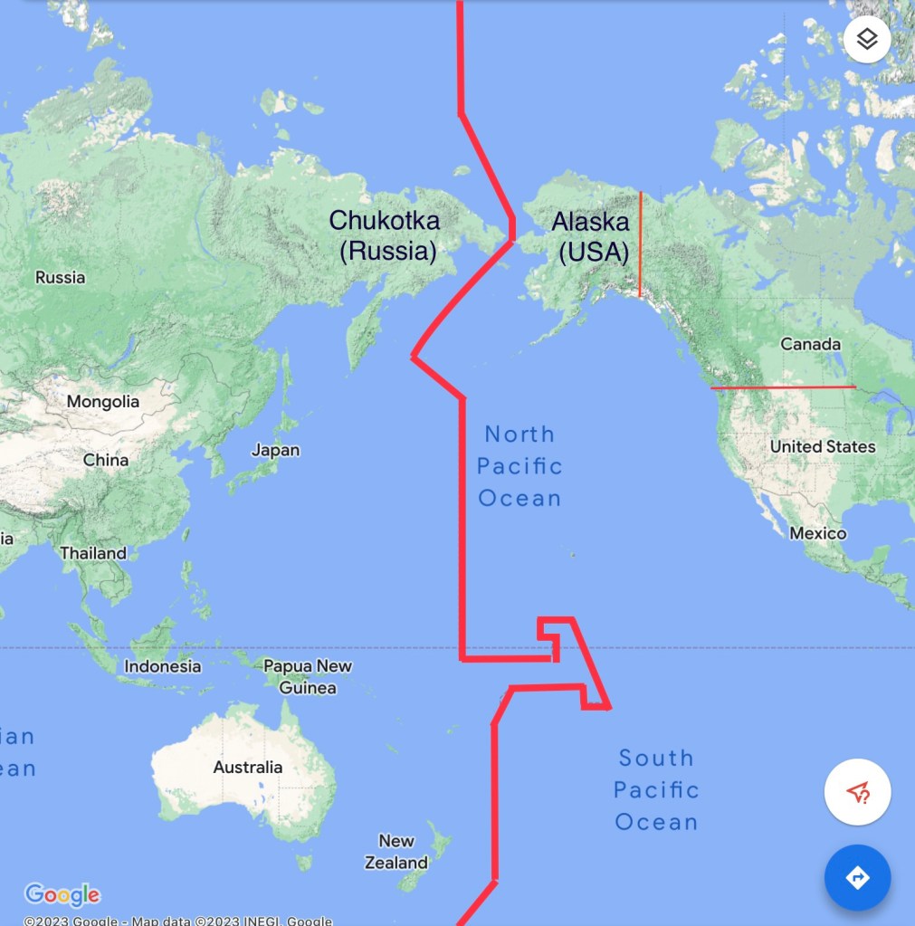 Đường đổi ngày đi qua eo biển Bering giữa lục địa Alaska (Mỹ) và Siberia (Nga), len qua giữa 2 hòn đảo: Diomede Lớn (Đảo Ngày Mai) và Diomede Nhỏ (Đảo Hôm Qua).