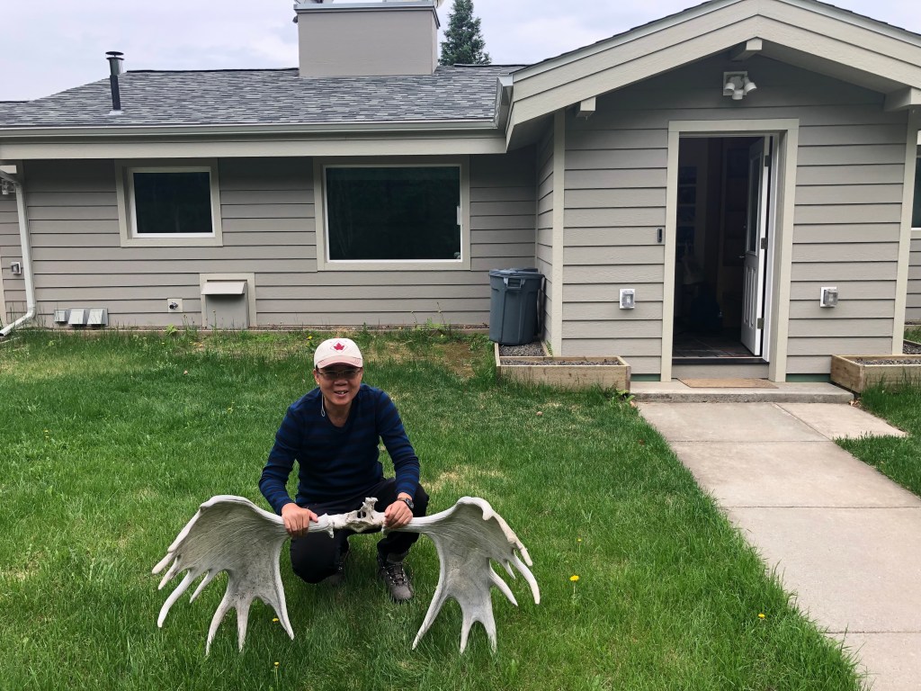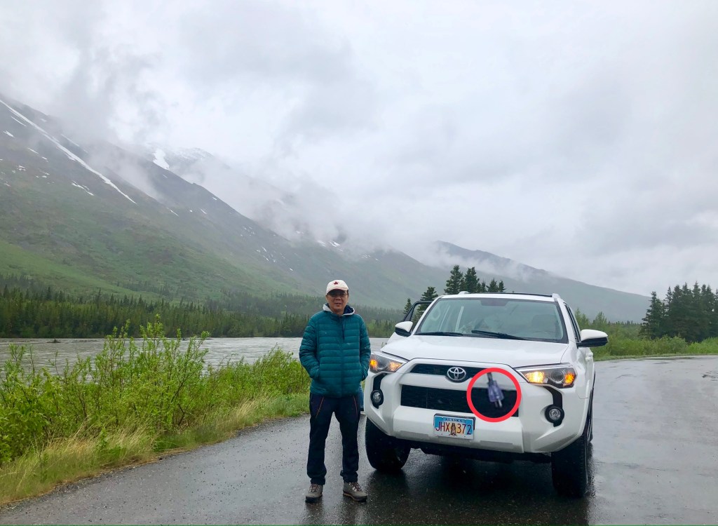 Phía trước xe có đầu dây cắm điện lòi ra từ động cơ. Chắc dùng để sạc bình ắc quy trực tiếp từ ổ điện, hay lúc khởi động xe vào mùa đông. Cả chuyến đi chưa phải dùng lần nào.Qua Internet thuê căn nhà. Tới nơi thấy nằm ngay giữa rừng. Nhìn từ trên cao xuống nhận rõ sự vắng vẻ.Hòm thư đặt ở ngoài đường, khá xa nhà, phải đi xe ra lấy Chụp trước nhà ở với cặp sừng con nai Alaska. Muốn đem ra khỏi vùng này phải xin giấy phép.Thú tự nhiên không phân biệt rừng và đường đi.Biểu tượng hợp tác Nga – Mỹ. Thời chiến tranh thế giới lần thứ 2 năm 1941-1945, Fairbanks là nơi tập kế vũ khí và trung chuyển bằng đường hàng không sang Nga.