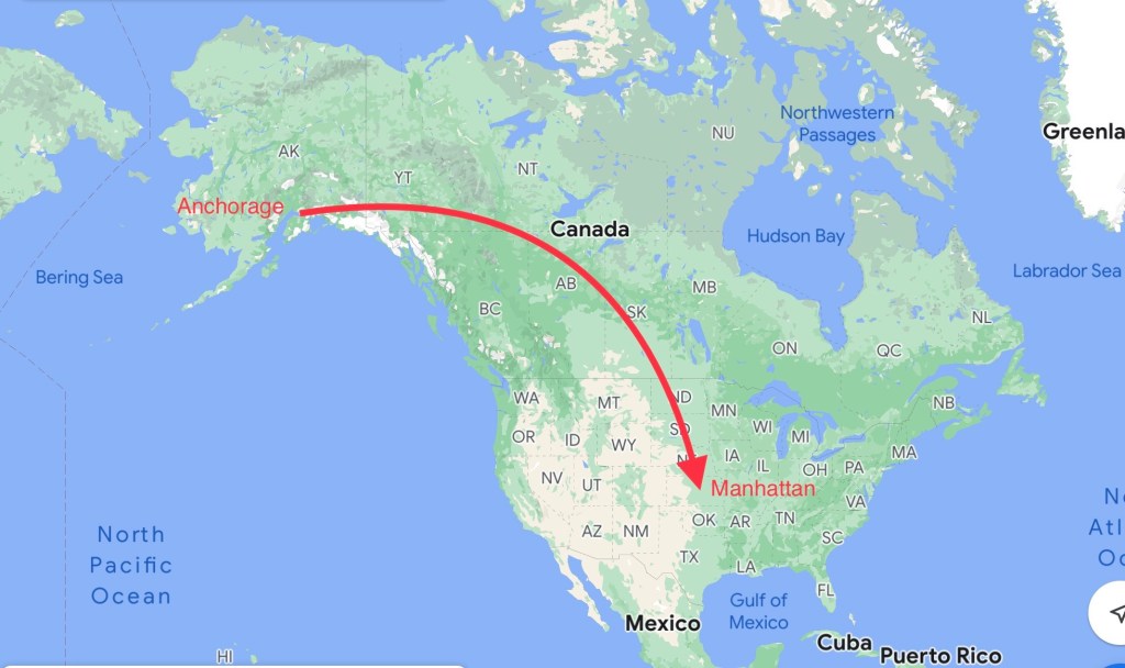Bay từ New York. Quá cảnh tại Seattle. Sau hơn 12 h mới tới TP Fairbanks của Alaska.