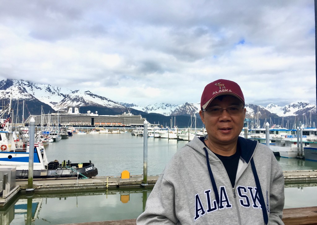 Seward là vịnh nước sâu. Sau lưng là con tàu lớn, giống như tòa nhà cao tầng, chứa được vài ngàn khách du lịch, đang neo đậu.Bên trái là những chiếc xe du lịch dạng căn hộ di động của du khách.