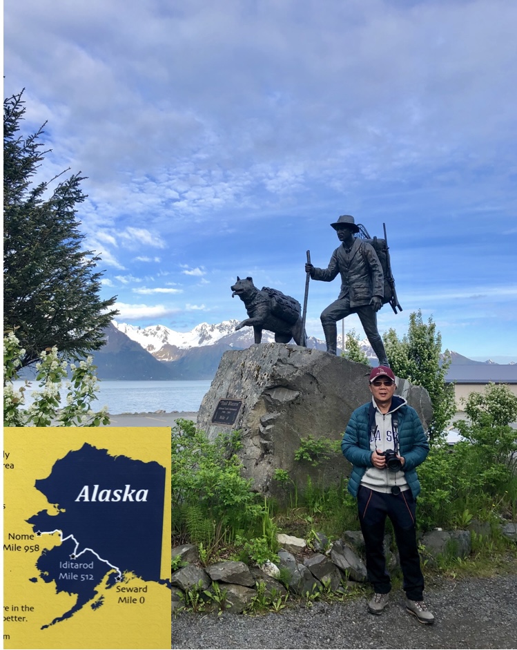 Biểu tượng của thành phố Seward: con chó và người dẫn đường tại km số 0.